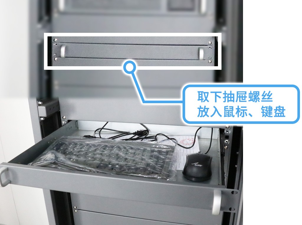 安装主机前先取下抽屉螺丝,放置鼠标和键盘;再用工具固定好显示屏8颗螺丝,然后翻转到主机背面;